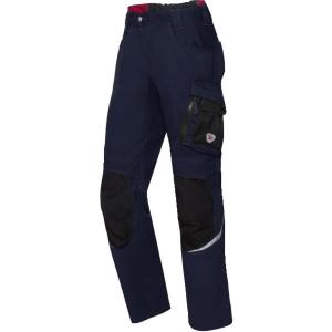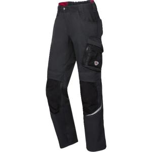 2 poches latérales avec empiècement stretch, 2 poches revolver avec fermeture à rabat, 1 grande poche cuisse avec poche smartphone intégrée, double poche mètre fixée d'un seul côté.